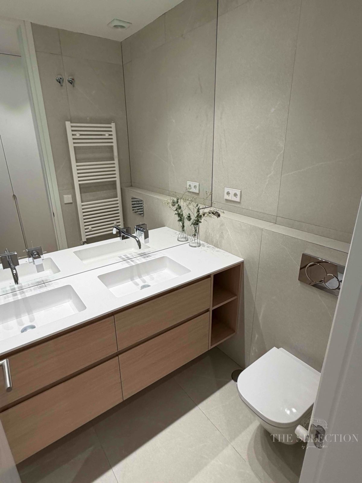 La vivienda, extraordinariamente luminosa, se sitúa en un edificio con un portal majestuoso que realza la distinción de la finca. En su interior, cada detalle ha sido cuidadosamente seleccionado: suelos en roble natural que aportan calidez y sofisticación, puertas lacadas de suelo a techo con un grosor y acabado impecables, y una cocina de diseño con 30 años de garantía que ofrece gran capacidad de almacenaje.