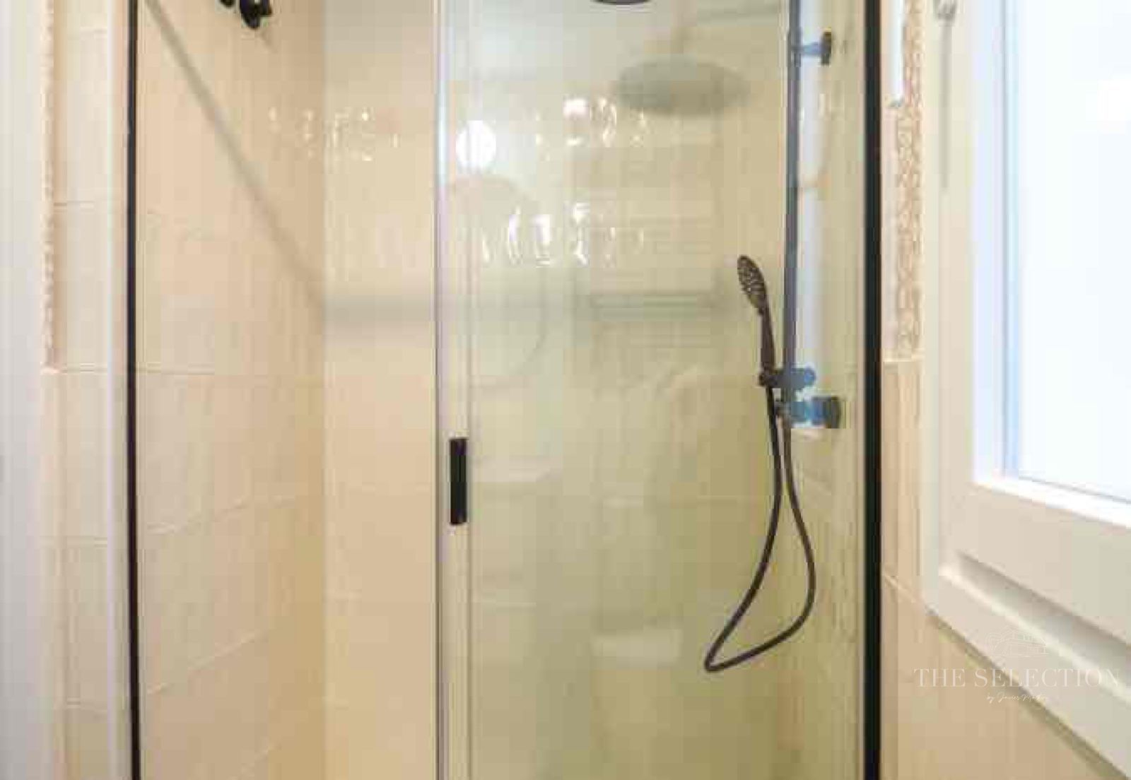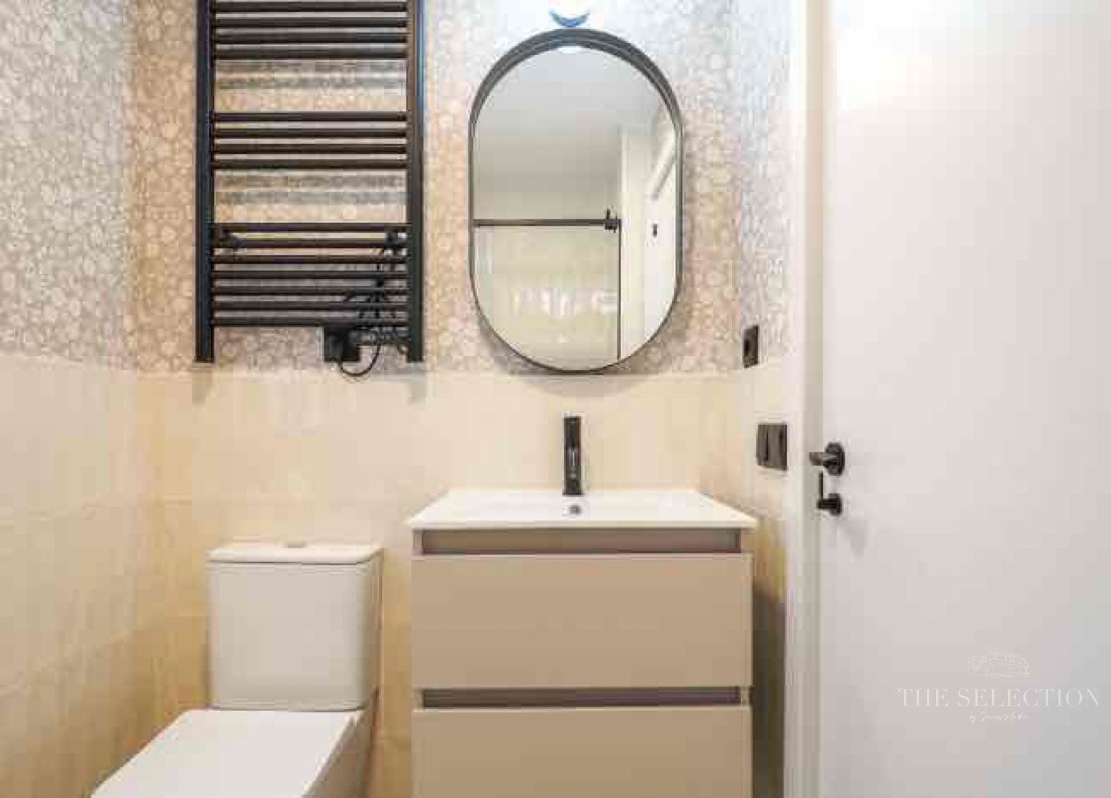 Los dos baños han sido objeto de un tratamiento especial en términos de materiales y acabados. La combinación de revestimientos porcelánicos en gran formato, azulejos decorativos de pequeño formato y papeles decorativos crea ambientes con carácter propio. Las griferías en acabado negro mate aportan coherencia visual y un toque contemporáneo al conjunto. Cada baño está totalmente equipado, con mamparas de ducha y muebles suspendidos.