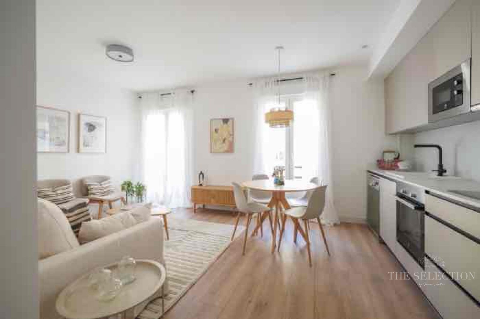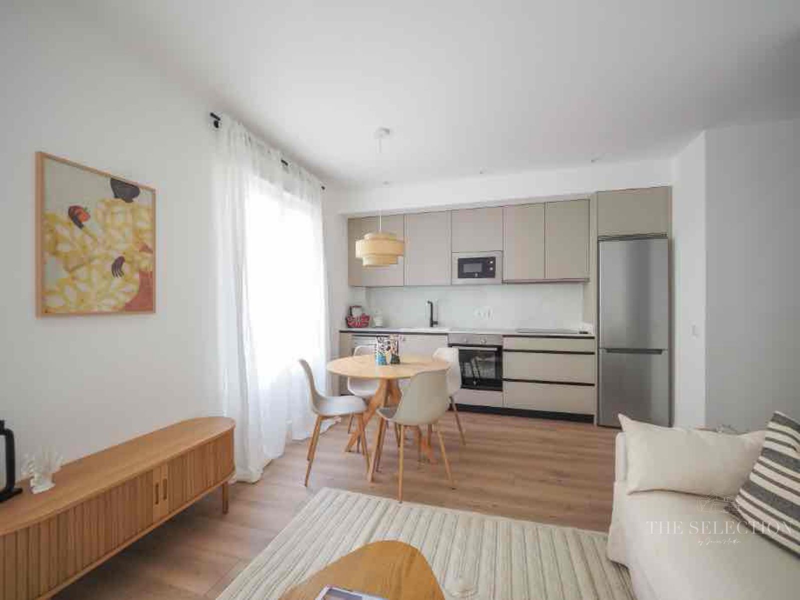 La zona de día apuesta por una distribución abierta donde cocina y salón se integran en un único espacio continuo, amplio y práctico. La cocina, equipada con electrodomésticos y resuelta con una estética contemporánea, se funde de forma natural con el área de estar y comedor. Además, desde el salón se accede directamente a un balcón que aporta luz natural e introduce ventilación cruzada, mejorando sensiblemente la calidad ambiental del conjunto. El suelo laminado de alta resistencia y las carpinterías de calidad refuerzan la coherencia de un espacio diseñado para el día a día.