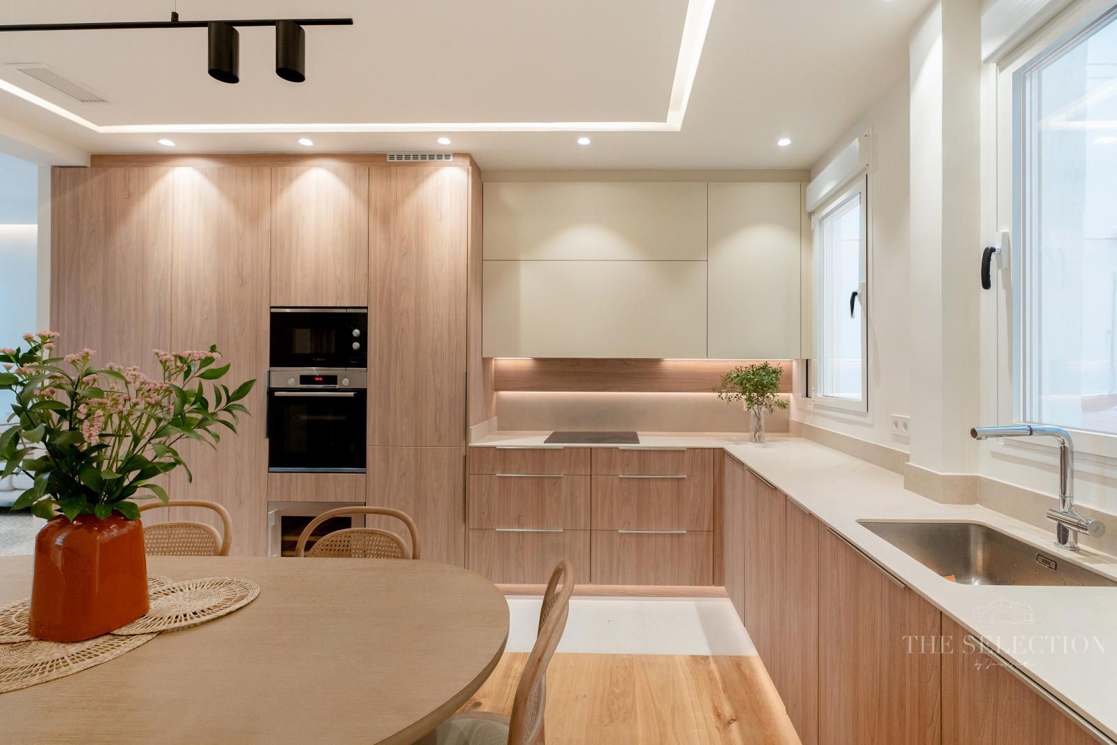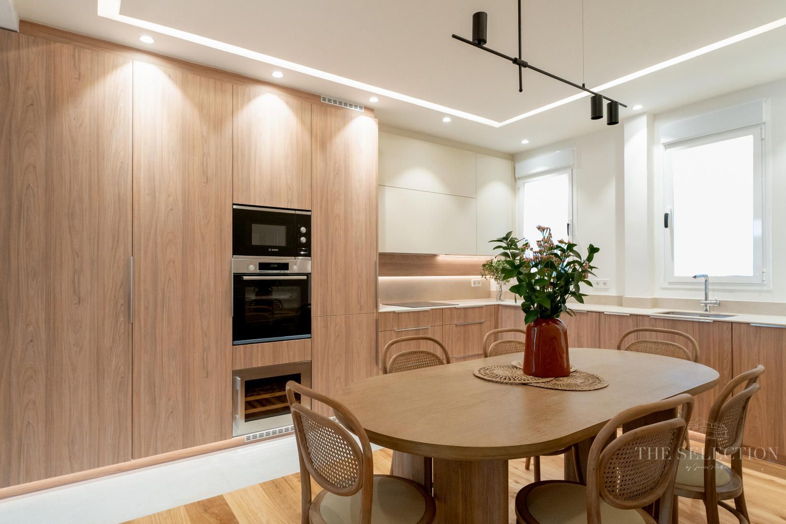 -Cocina independiente de diseño moderno con 4,3 m², completamente equipada, con carpintería lacada, iluminación LED y campana extractora empotrada.